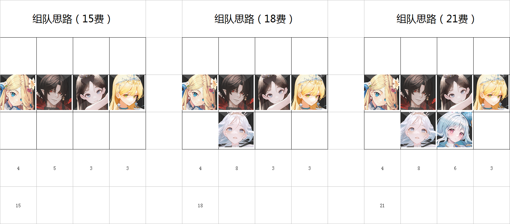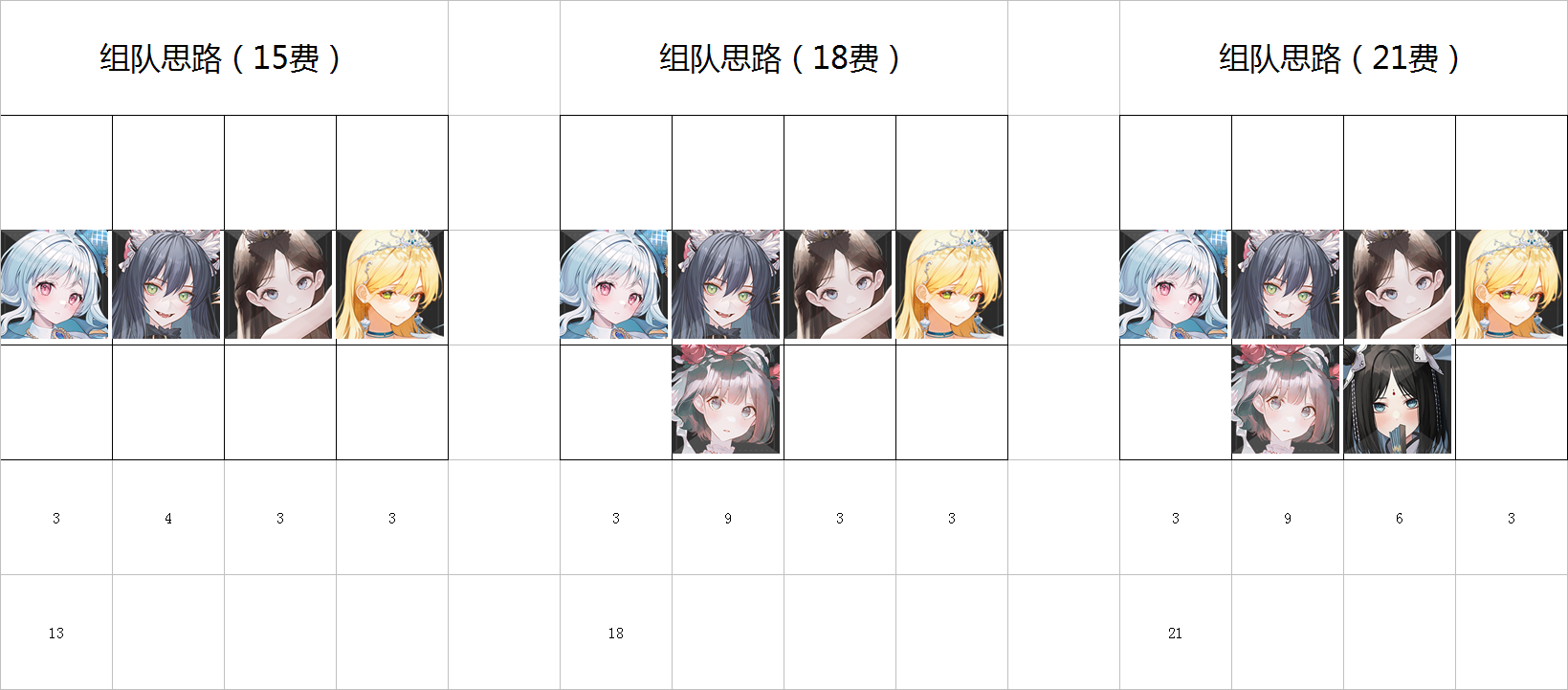 所以,在盾量足够扛得住气的情况下,或许可以这样。这个队伍思路输出方面其实基本和第一面不变,区别在于后续一直保生存。如果直接生存无忧,第二面白雪改为德古拉或者爱丽丝,或者其他5费输出。第三面补3费输出或者换成2个4费输出。