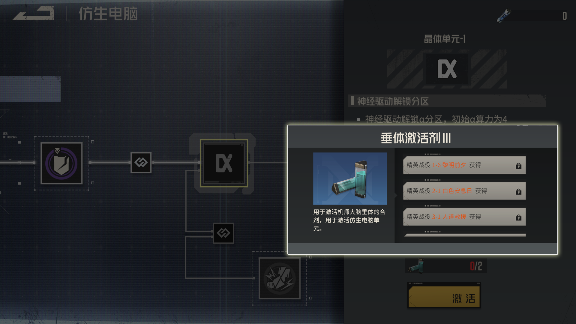 上一篇中,我们提到了还可以通过解锁仿生电脑中的各个单元的方式来提升机师的能力,那么需要消耗什么呢?自然就是我们的各类药剂了,在没有当前药剂的时候还可以点击所需的药剂图标,查看可以在哪获取。