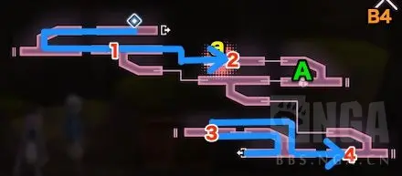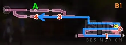 B1 → B5 → B3 → B2 → B4 B1: 先从1到4拿完B1道具, 传送B5左侧 B5: 向右拿到3后传送回左侧, 拿完4传送B3 B3: 如图走个折返, 拿完4传送B2 B2: 向右拿2, 传送B3逆向跑B2拿完4传送B5 B4: 逆向跑B4拿完3, 传送B4拿4 | ![]() |