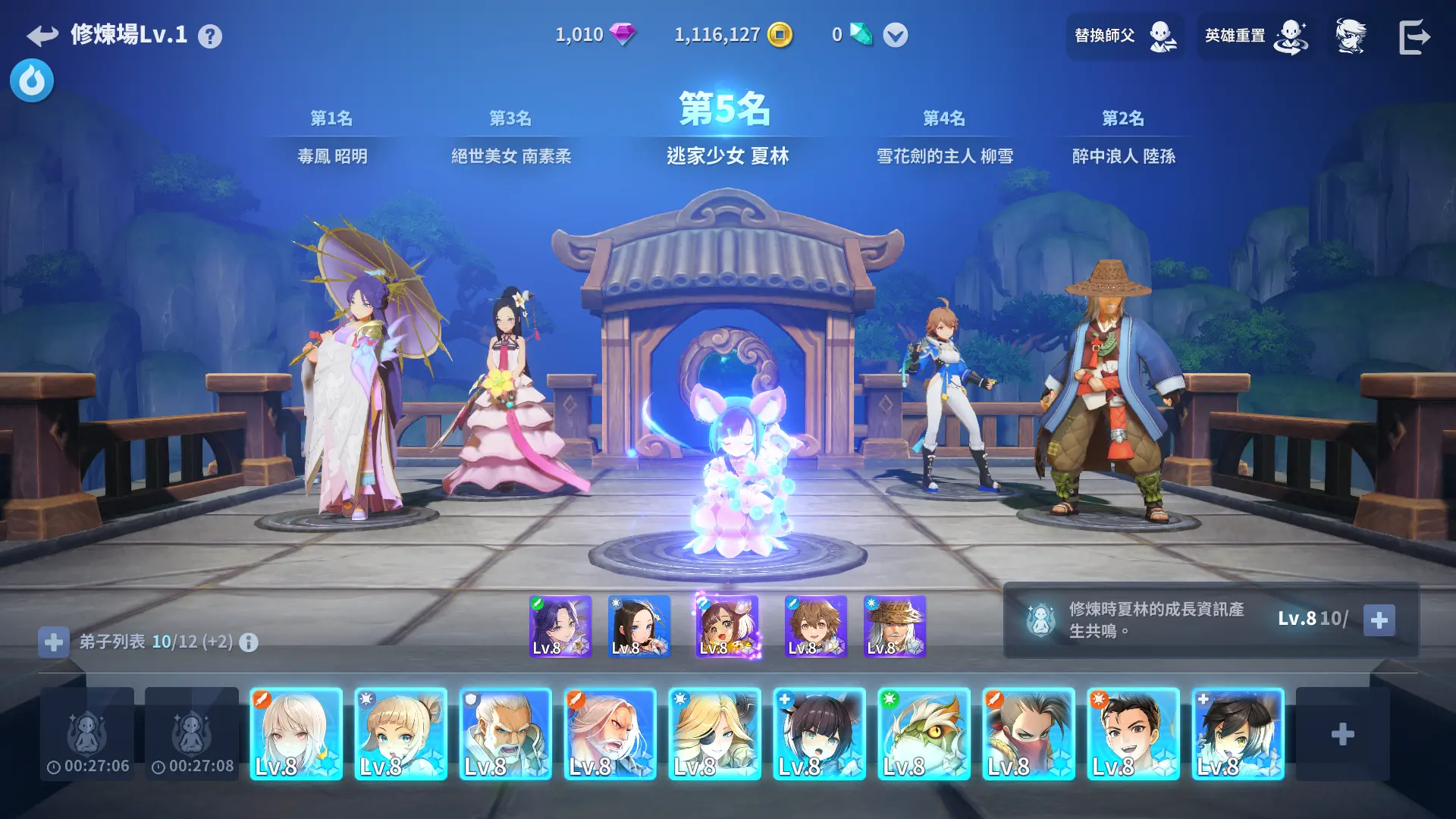 实际上,在我们进行游戏的时候,我们只需要培养五个角色的等级就可以了,其余角色的等级可以在家园—修炼场中,和出战的那五位角色中,等级最低的角色共享。