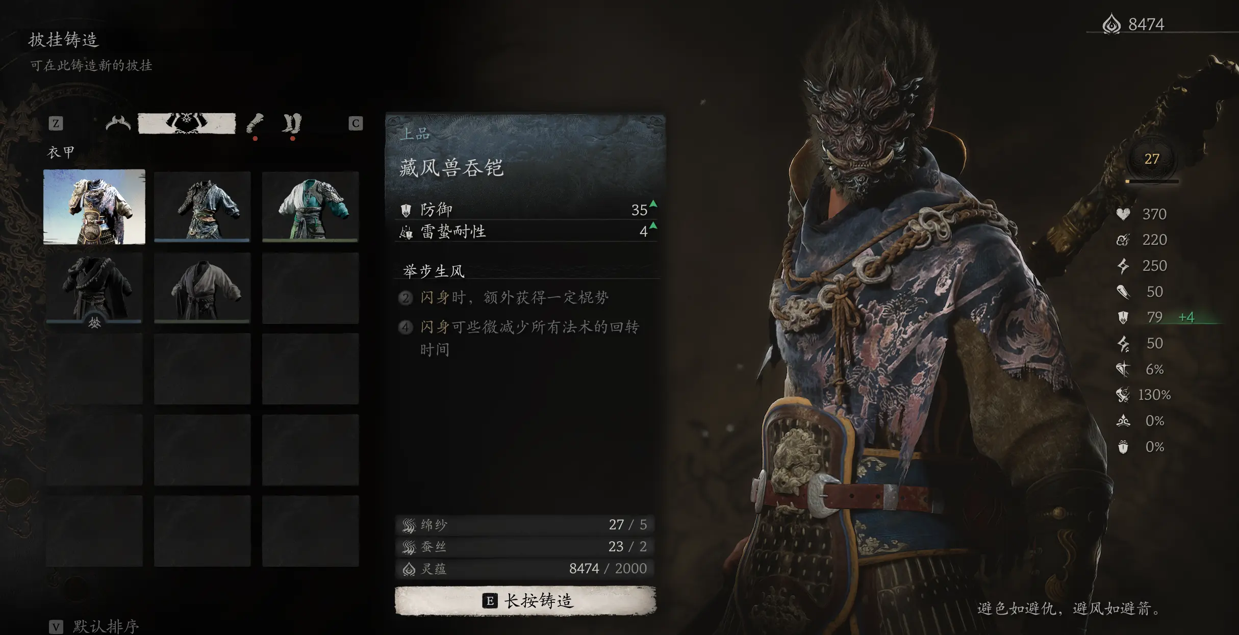 所获得的武器和装具,都会和这一章的Boss相关,比如说黄风岭的藏风兽吞甲,就是应对关底雷属性的大Boss用的。穿上这些装备,可以让我们不用那么坐牢。