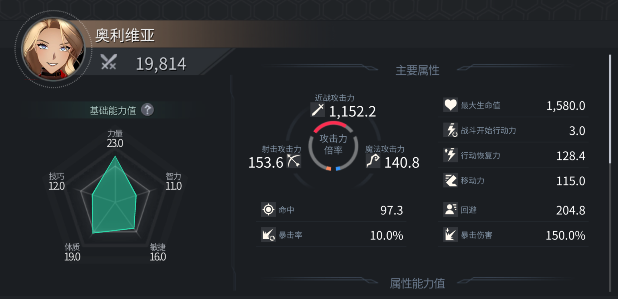 机制与数值并存,角色虽然不能暴击,但是把技能效果把攻击力的数值拉爆,仅一个被动技能就超越了女王5级专武和伊奈丝5级专武的数值之和。核心机制为敌方行动后,奥利维亚会进行一次AOE追加应对,同时重置自身AP。相当于每回合4~5次追加AOE同时还有4~5次平A。