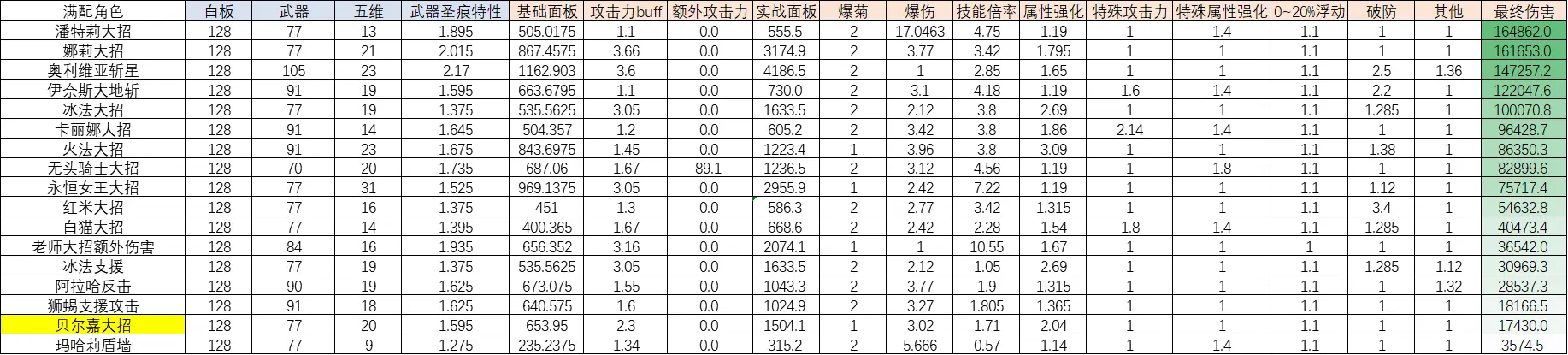 满配无辅助角色情况下,单次伤害基本垫底。 亏了2个独立乘区,伤害低正常。依靠攻击次数补回来了。