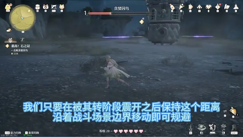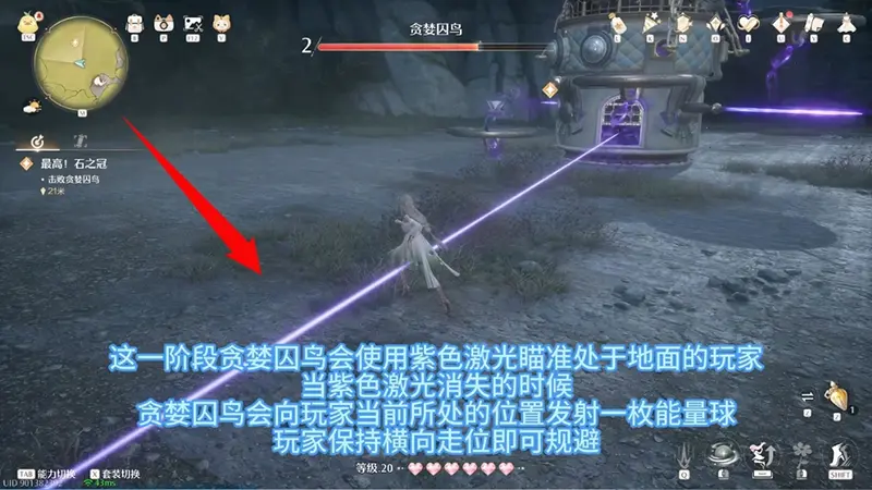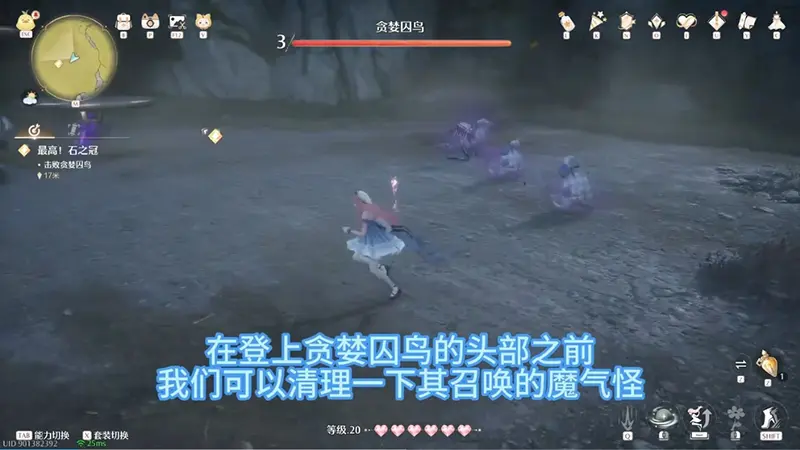 冲锋鸟车,保持距离绕圈规避。跳上平台,需规避魔气怪,头顶部下砸破坏宝石击败贪婪囚鸟吧~
