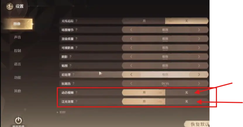 动态模糊和泛光可能引起部分搭配师的3D眩晕和眼睛不适等问题,关闭方式如下:
