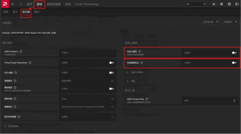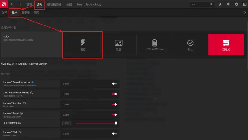 1、Radeon Super Resolution:FSR,该项不建议开启,只建议在游戏中单独设置