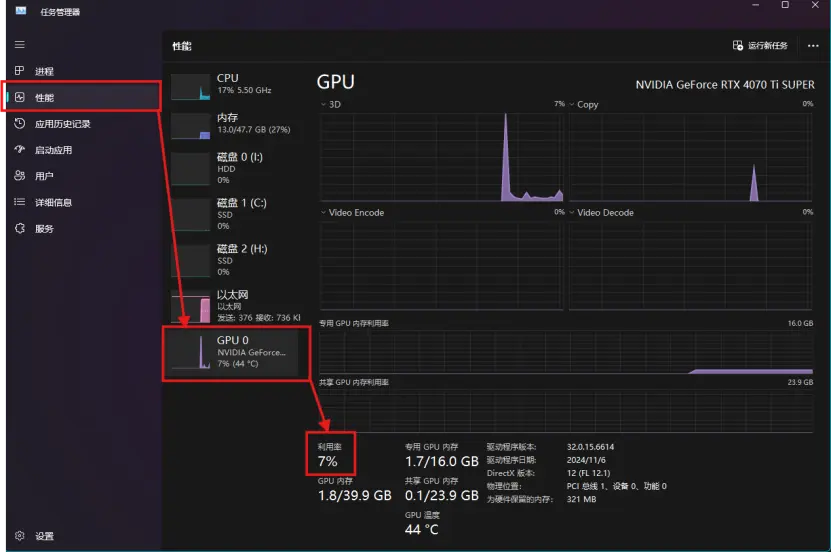 在游戏运行时,右键点击任务栏打开“任务管理器” > 查看“性能”选项卡中的GPU独显是否占用资源。