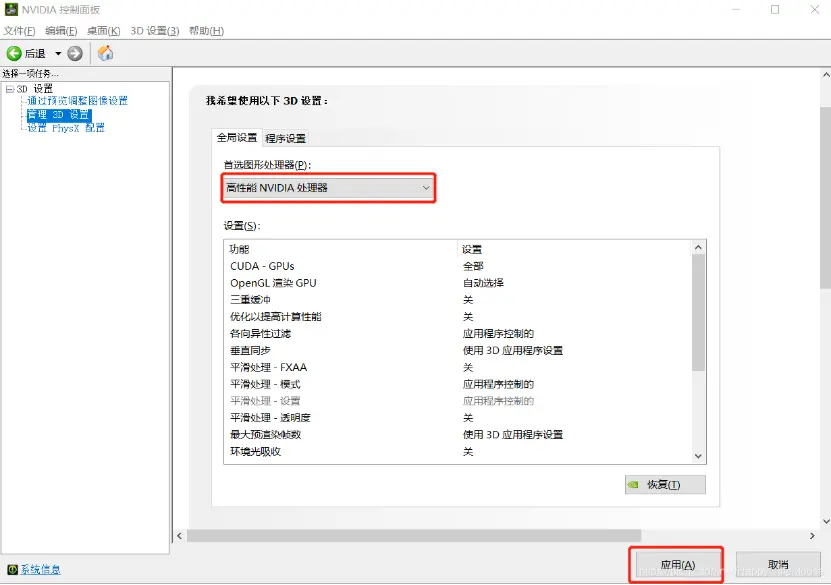 选择“高性能NVIDIA处理器”。
