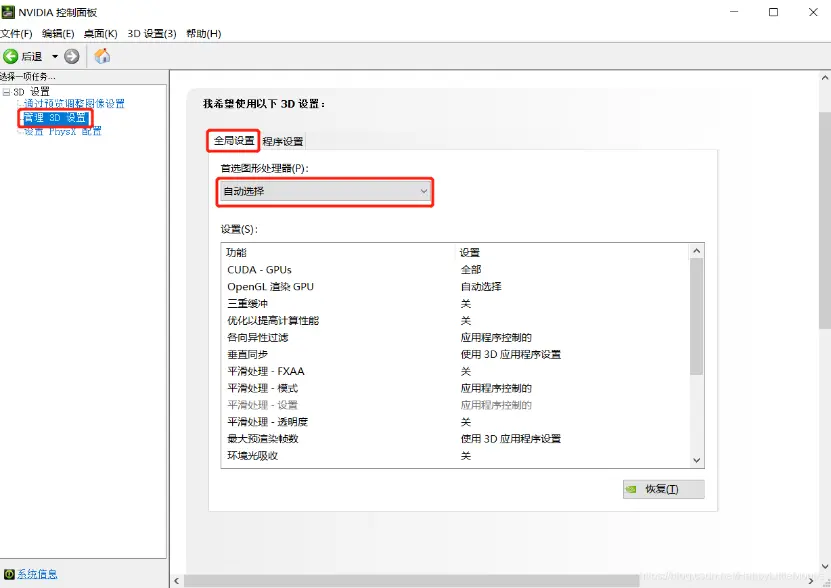 选择“管理3D设置” > “全局设置”
