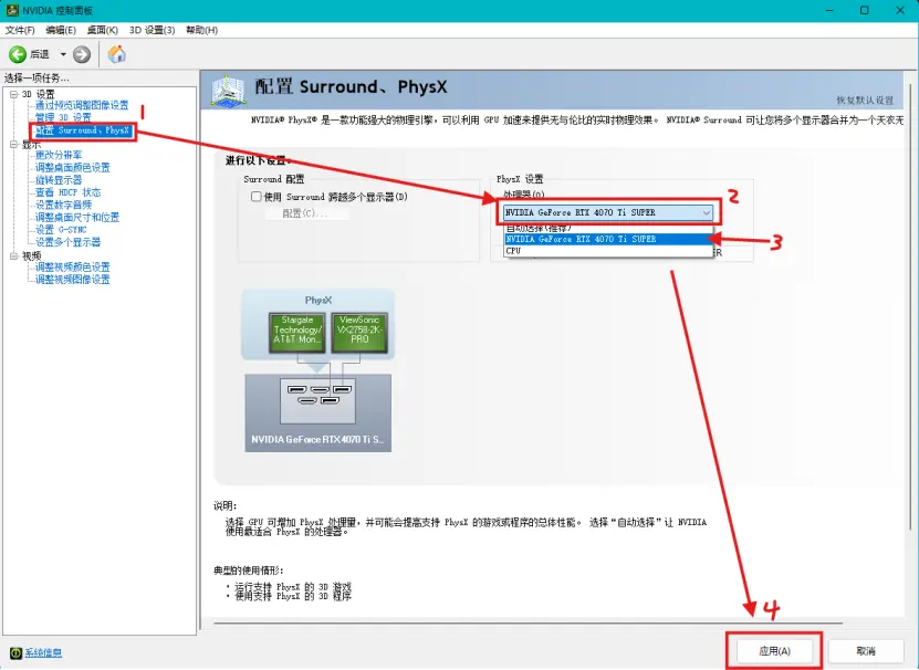 ② 打开“ 配置Surround、PhysX ” > “ 选择 PhysX处理器 ” > 选择“ 你的独立显卡(缇米的显卡是NVIDIA Grforce RTX 4070Ti SUPER)” > 应用