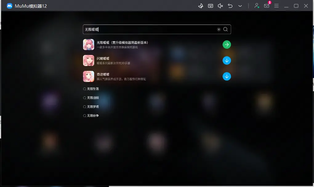 步骤三:安装完成后,启动MuMu模拟器12,搜索框直接搜索下载游戏,安装成功后即可成功进入《无限暖暖》!MuMu游戏中心内置官服,支持安卓、iOS双端登录,和PC、PS5账号互通,也可下载B服。