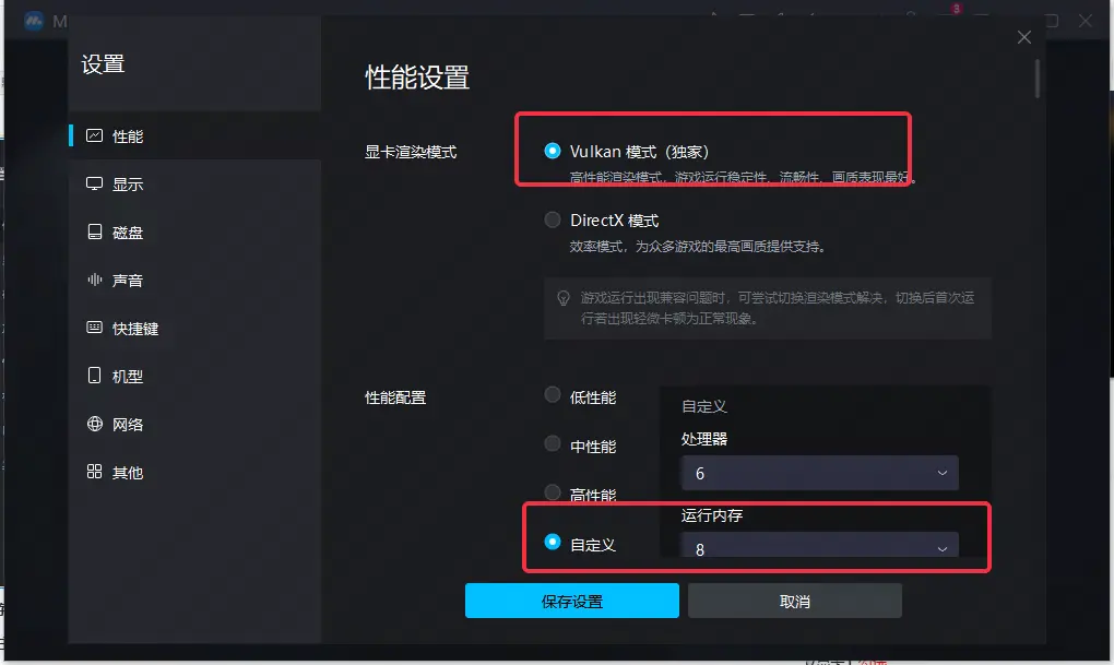 若想开启【极致】画质,需要在性能设置界面保证运行内存在8G