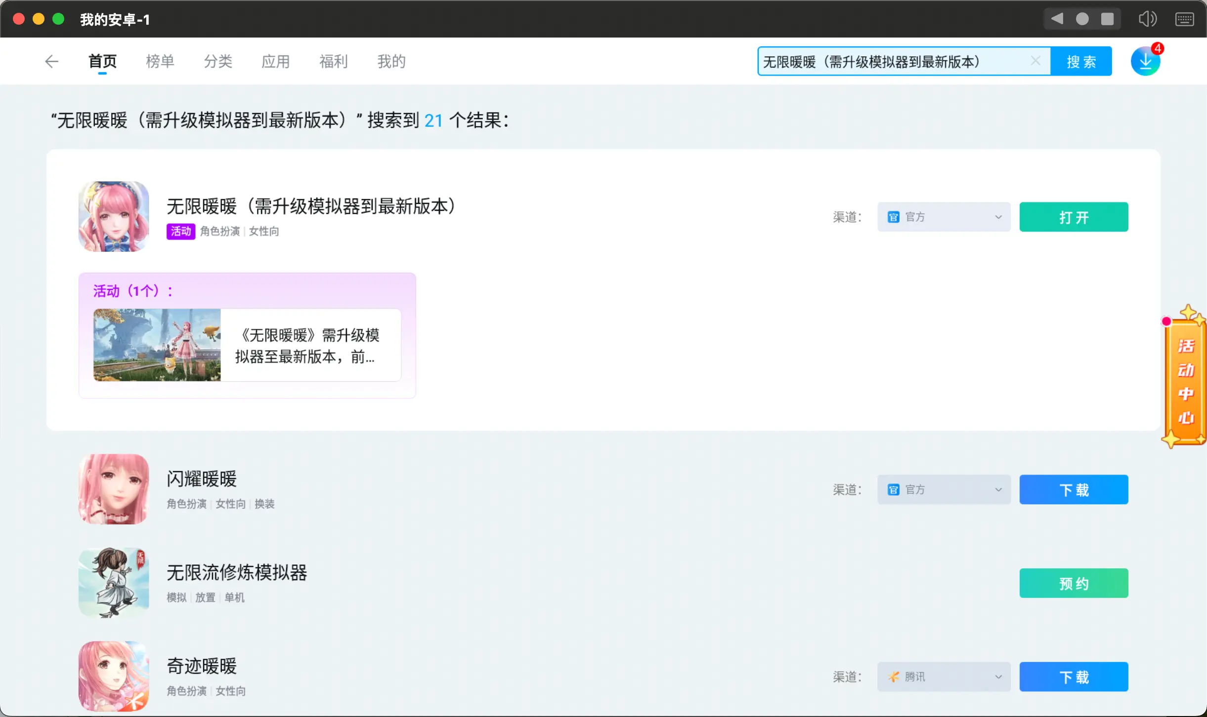 Mac电脑在启动台里启动MuMu模拟器Pro,点击桌面的游戏中心,进入搜索《无限暖暖》,点击下载即可。