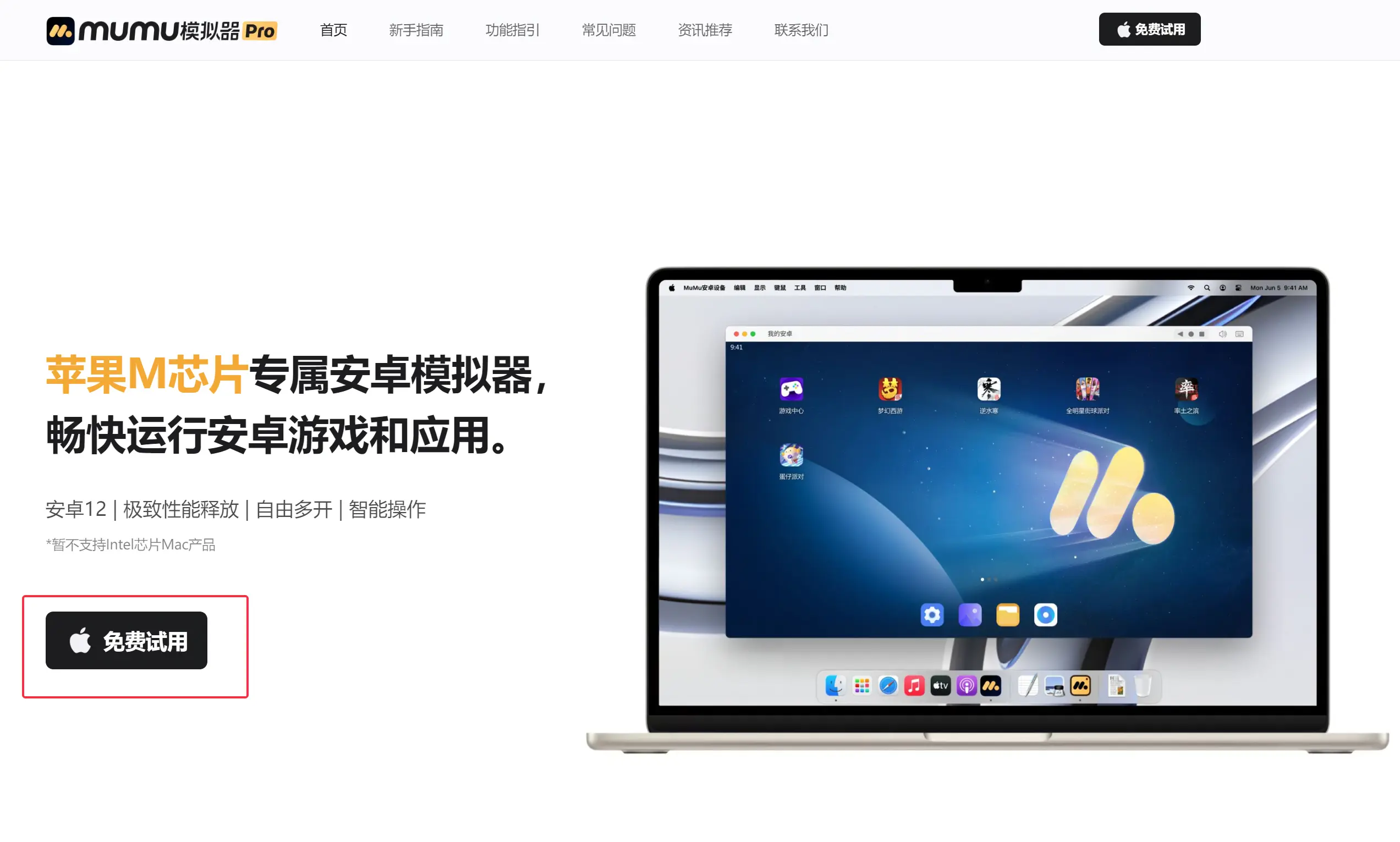 步骤一:前往MuMu模拟器官网(https://mumu.163.com/),M芯片Mac电脑会自动跳转到MuMu模拟器Pro官网,下载并安装最新版模拟器。