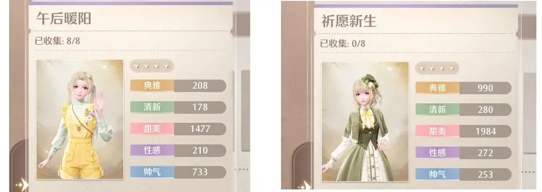 四、【服装焕新】不推荐养任何主线套装,以午后暖阳(主线套装)和祈愿新生(兑换套装)为例子,都是四星套装,但是主线套装的主副属性分数要低35%左右