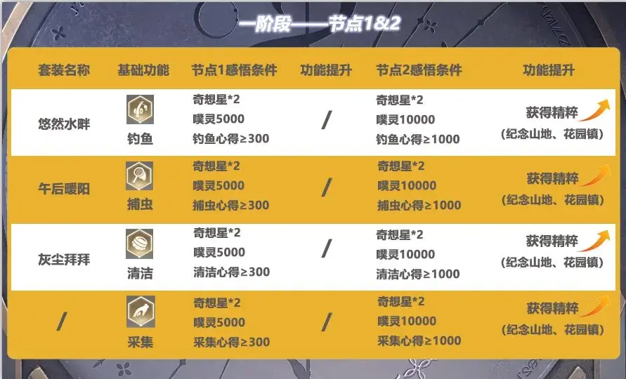 无限之心的捕虫、钓鱼、清洁、采集的能力进化,主要功能是获得“精粹”,一件服装所需要的精粹不是单一的,建议两个节点为一阶段,平均拉