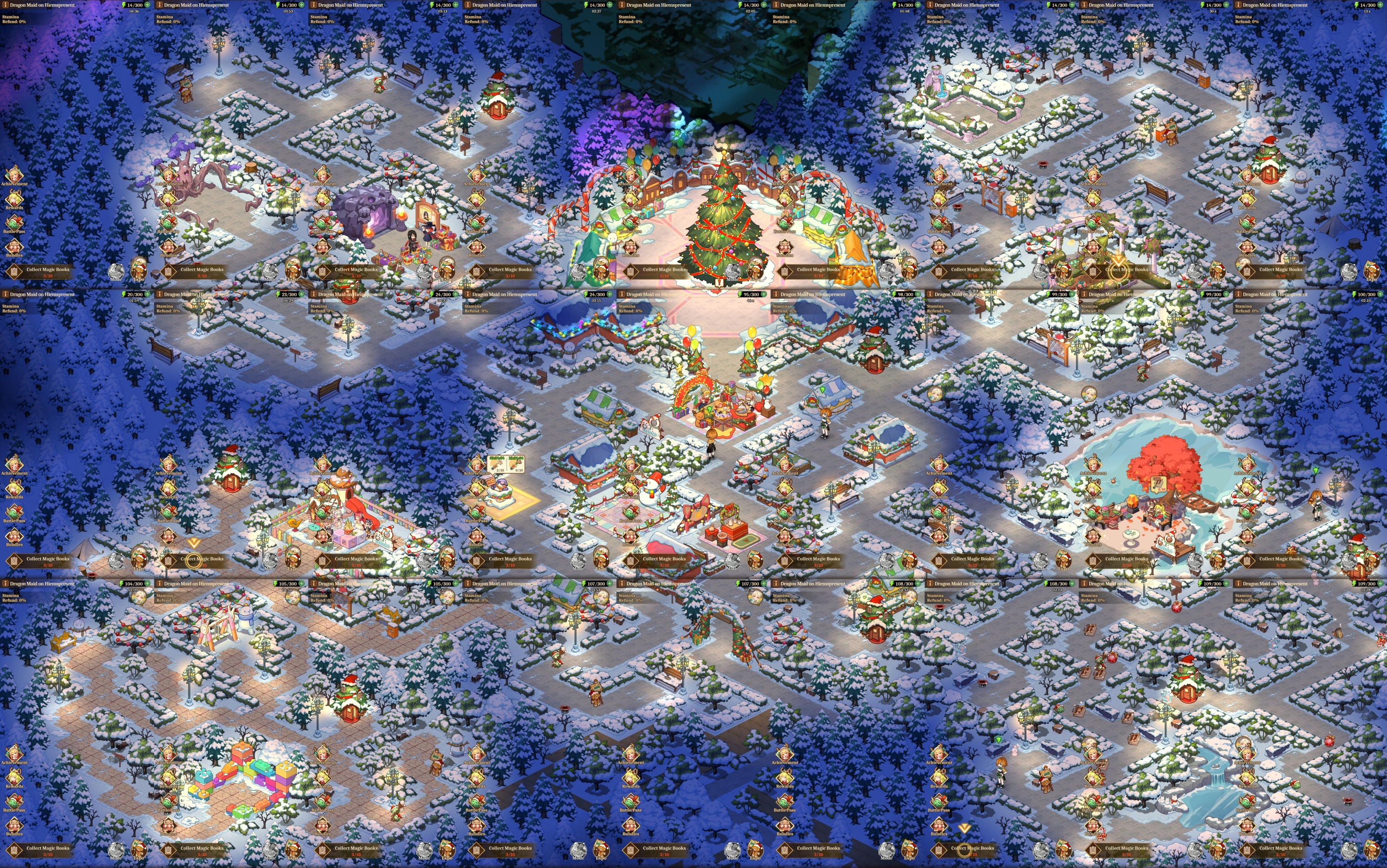 2.地图交互点,茶话会(用巧克力等5分钟换10体力),五地点联动对话(需要各10对应道具解锁对话才能开启特定大门),大圣诞树(需要四种装饰礼物各15个解锁),小圣诞树(需要1个绒球解锁),雪人(需要2个胶卷解锁),米拉克的魔术帽(需要1个兔子解锁),姜饼指示牌(领取道具+展销会道具),冰冻的滋水萝卜(找到25个完成任务),钥匙发放处(到时间给姜饼钥匙+驯鹿钥匙),礼物堆放处(驯鹿钥匙打开),姜饼门(姜饼钥匙打开),篮子(给体力),蓝色小礼品盒,大礼品盒
