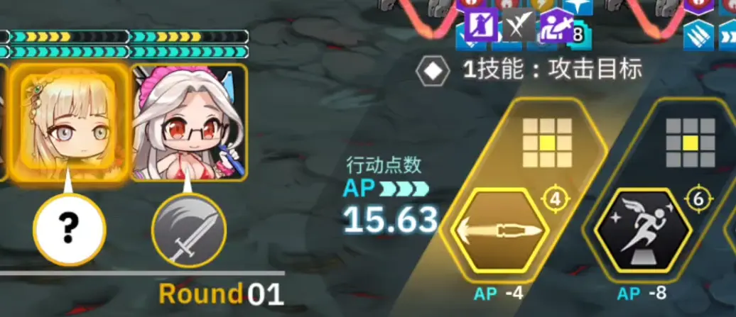 02的第一次行动选择1技能(剩余12点ap),第二次行动待机(剩余11点ap),此时返回第一次操作并重新选择1技能,系统会判断此时的ap>10,那么02就会出现第三次行动,然后把三次行动都选择2技能。