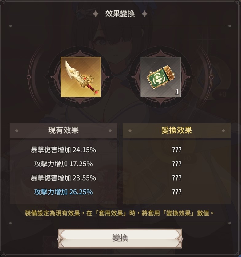 - 使用「效果變換票券」即可重新賦予裝備特殊效果