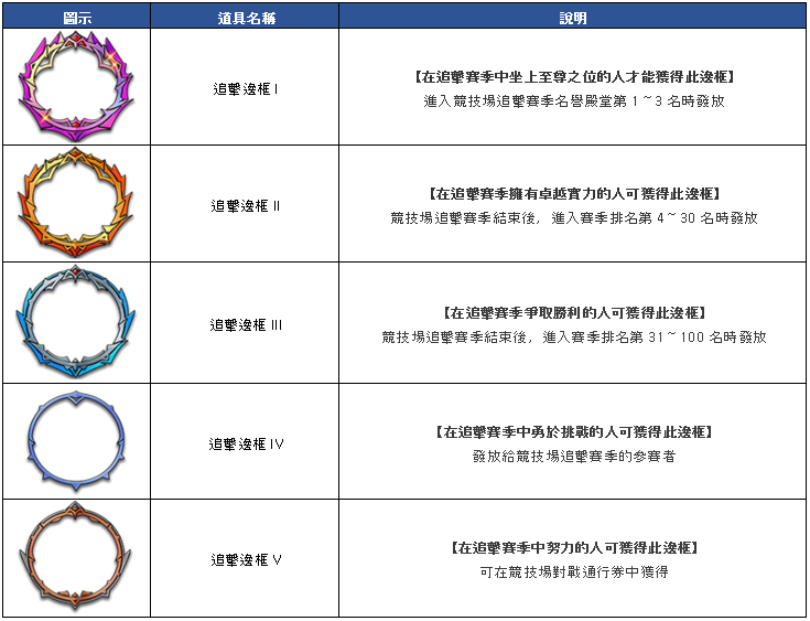- 「競技場-追擊賽季」結束後,將可依照賽季的排名來獲得「追擊賽季」的專屬邊框。