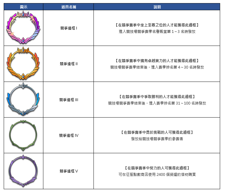- 「競技場-追擊賽季」結束後,當全新正規賽季開始後,將會依照「競技場-追擊賽季」的排名來發放專屬邊框獎勵。