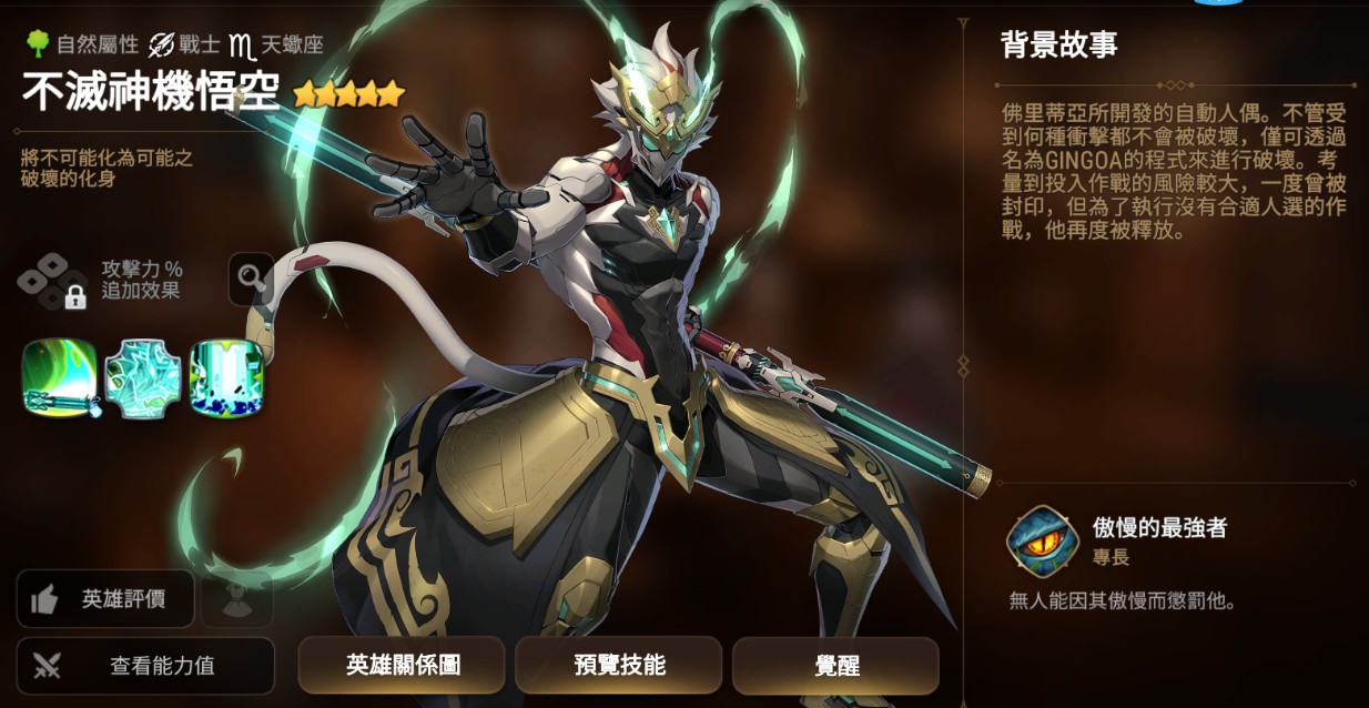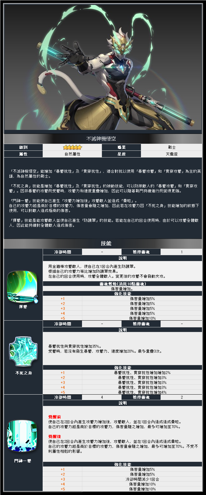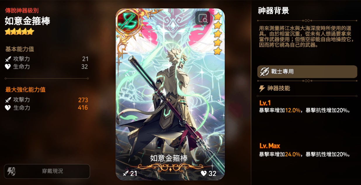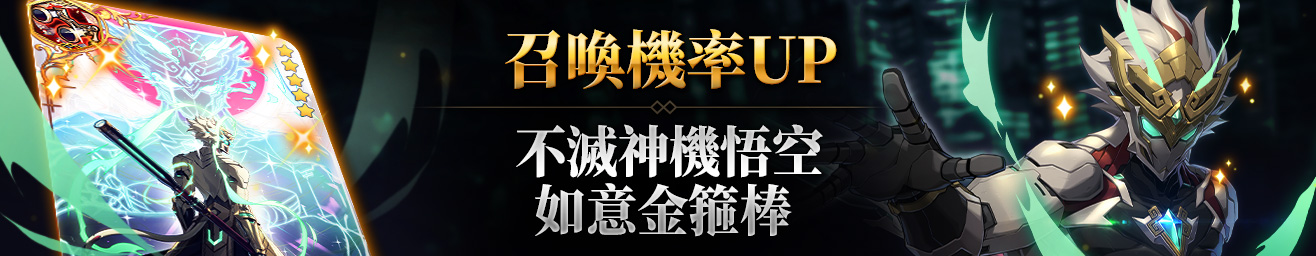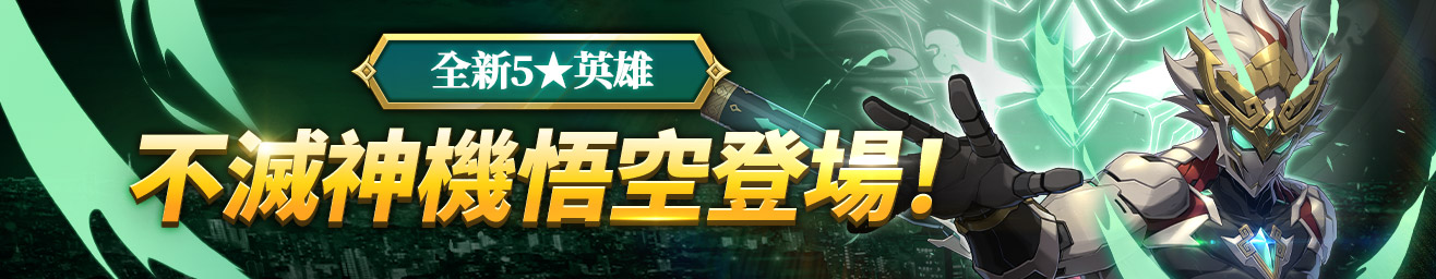 能增加「暴擊抗性」及「貫穿抗性」,適合對抗以使用「暴擊攻擊」和「貫穿攻擊」為主的英雄,,自然屬性的戰士-「不滅神機悟空」!以及增加「暴擊率」及「暴擊抗性」的戰士專用神器-「如意金箍棒」!請試著在「召喚機率UP!」中遇見他們吧!