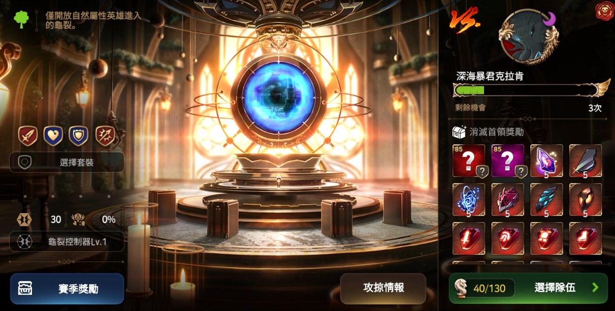 - 在「龜裂」副本配置隊伍時,僅能配置各賽季指定屬性的英雄。