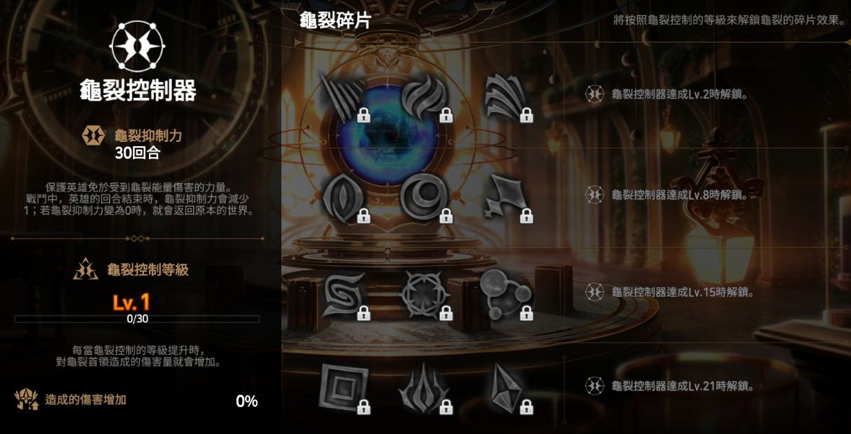 - 每當【龜裂控制等級】達到指定等級時,即可解鎖【龜裂碎片】效果。