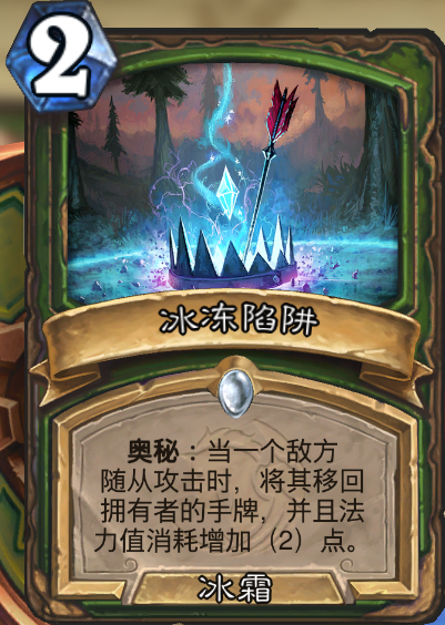 冰冻陷阱_冰霜 基础信息 冰冻陷阱费用2适用职业/画家Matt Gaser属性冰霜效果描述奥秘:当一个敌方随从攻击时,将其移回拥有者的手牌,并且法力值消耗增加(2)点。卡牌简介“呢,好冷。”一一当你中了冰冻陷阱或是听到一个冷笑话时,通常都是这个反应。