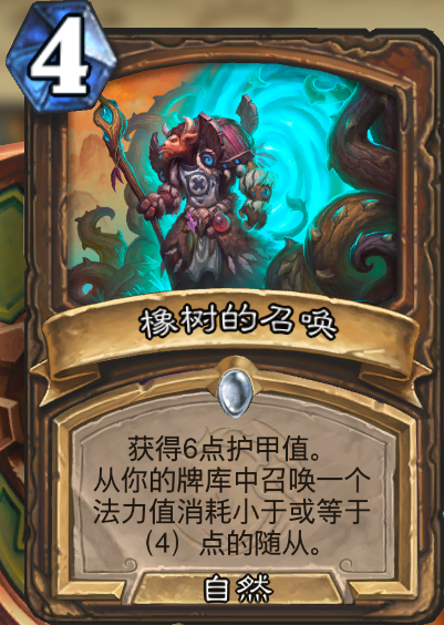 橡树的召唤_自然 基础信息 橡树的召唤费用4适用职业/画家stantin Turovec属性自然效果描述获得6点护甲值。从你的牌库中召唤一个法力值消耗小于或等于4)点的随从。卡牌简介橡树代表着荣誉与力量,所以它们都被砍倒建房子了。