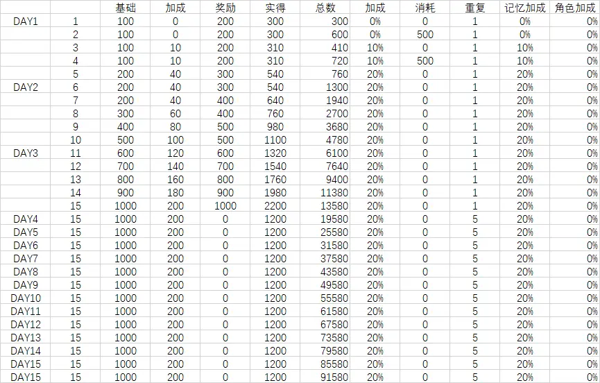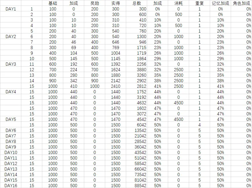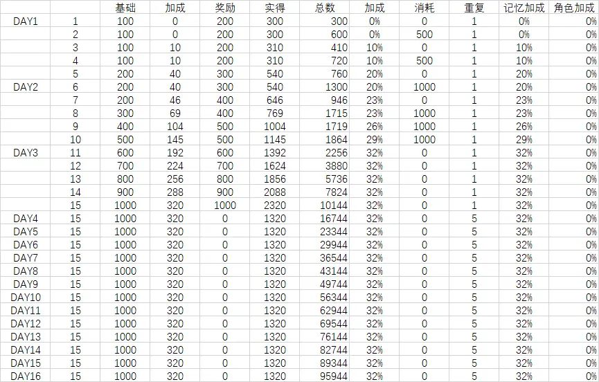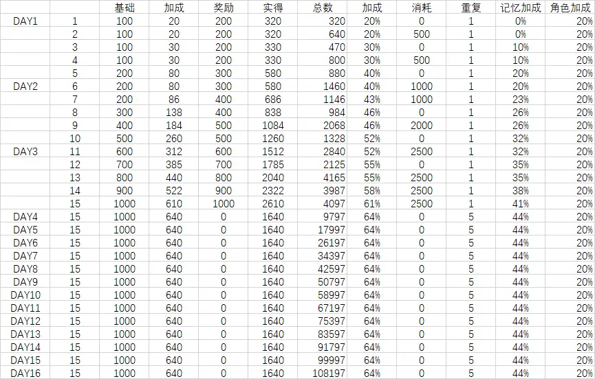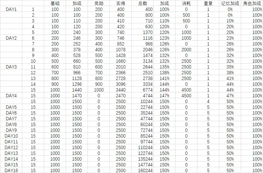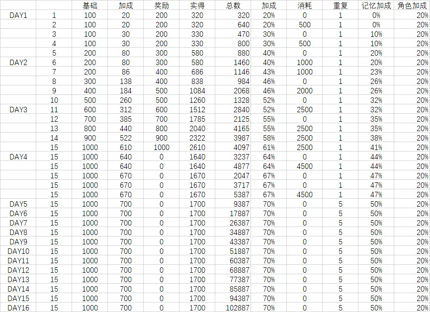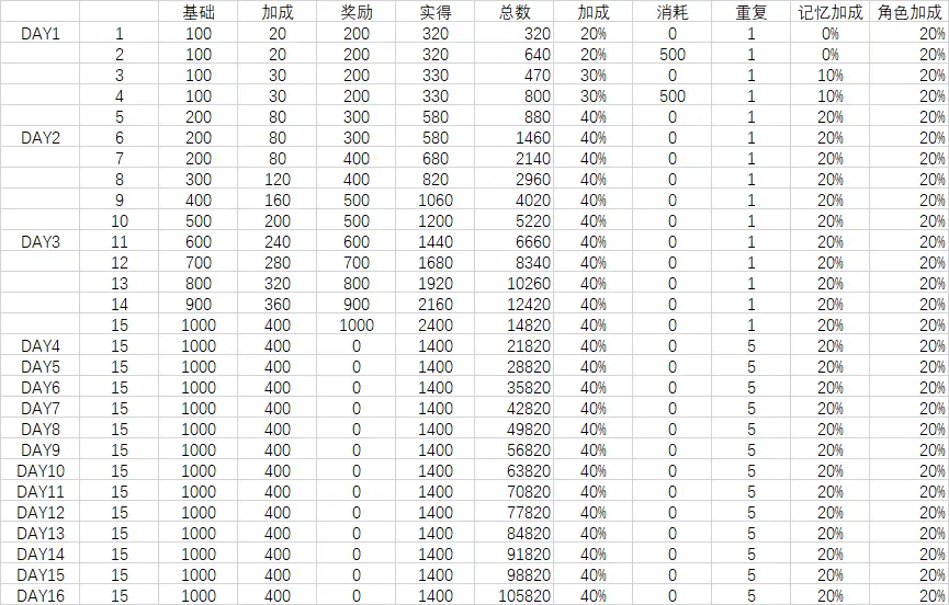 由表可得活动结束前0加成角色在前三天可兑换完毕记忆