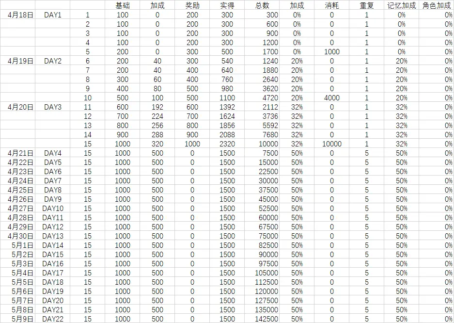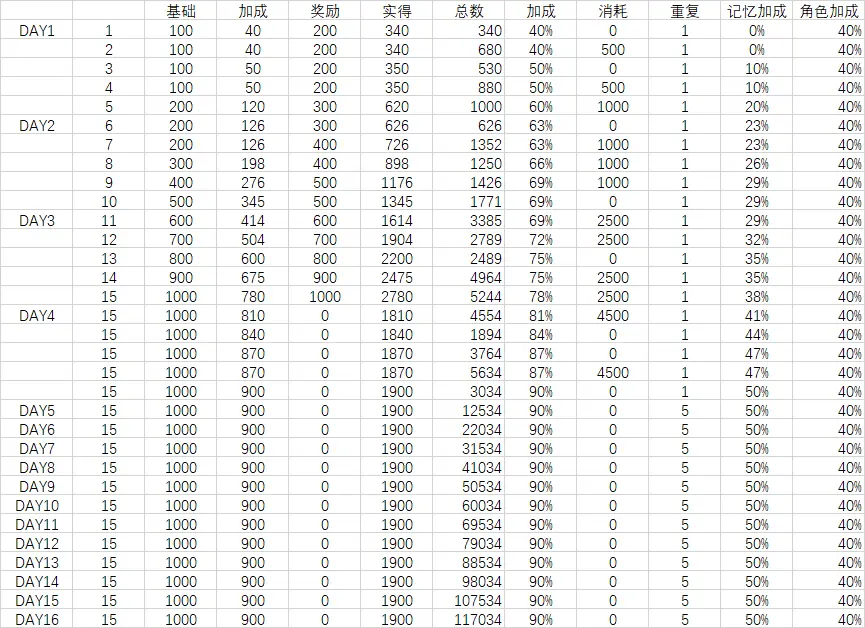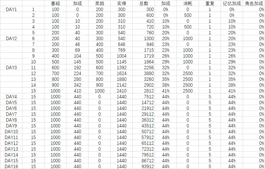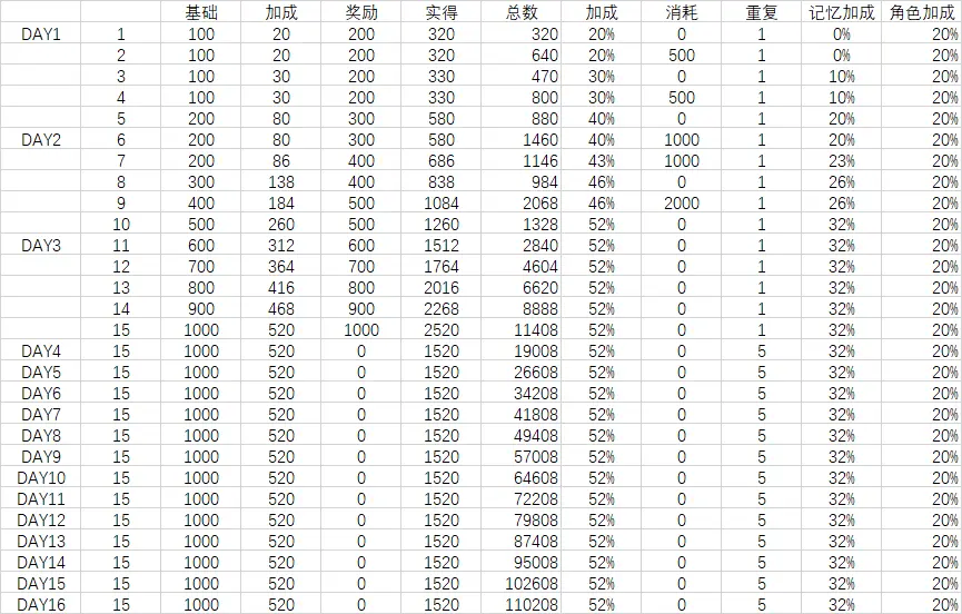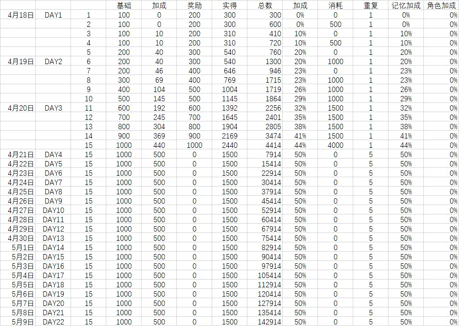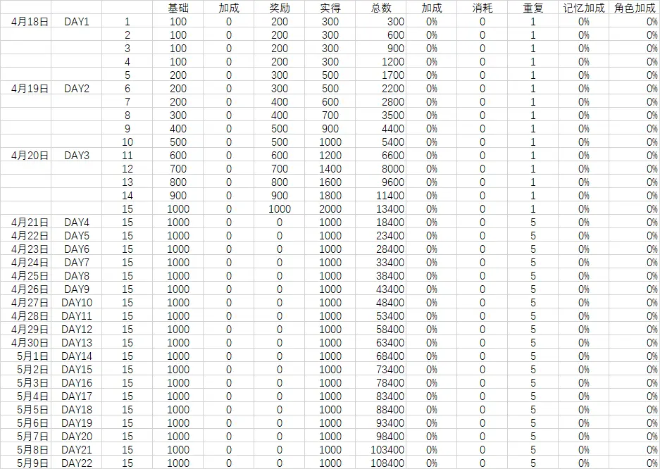 由表可得活动结束前0加成角色在前三天可兑换完毕记忆