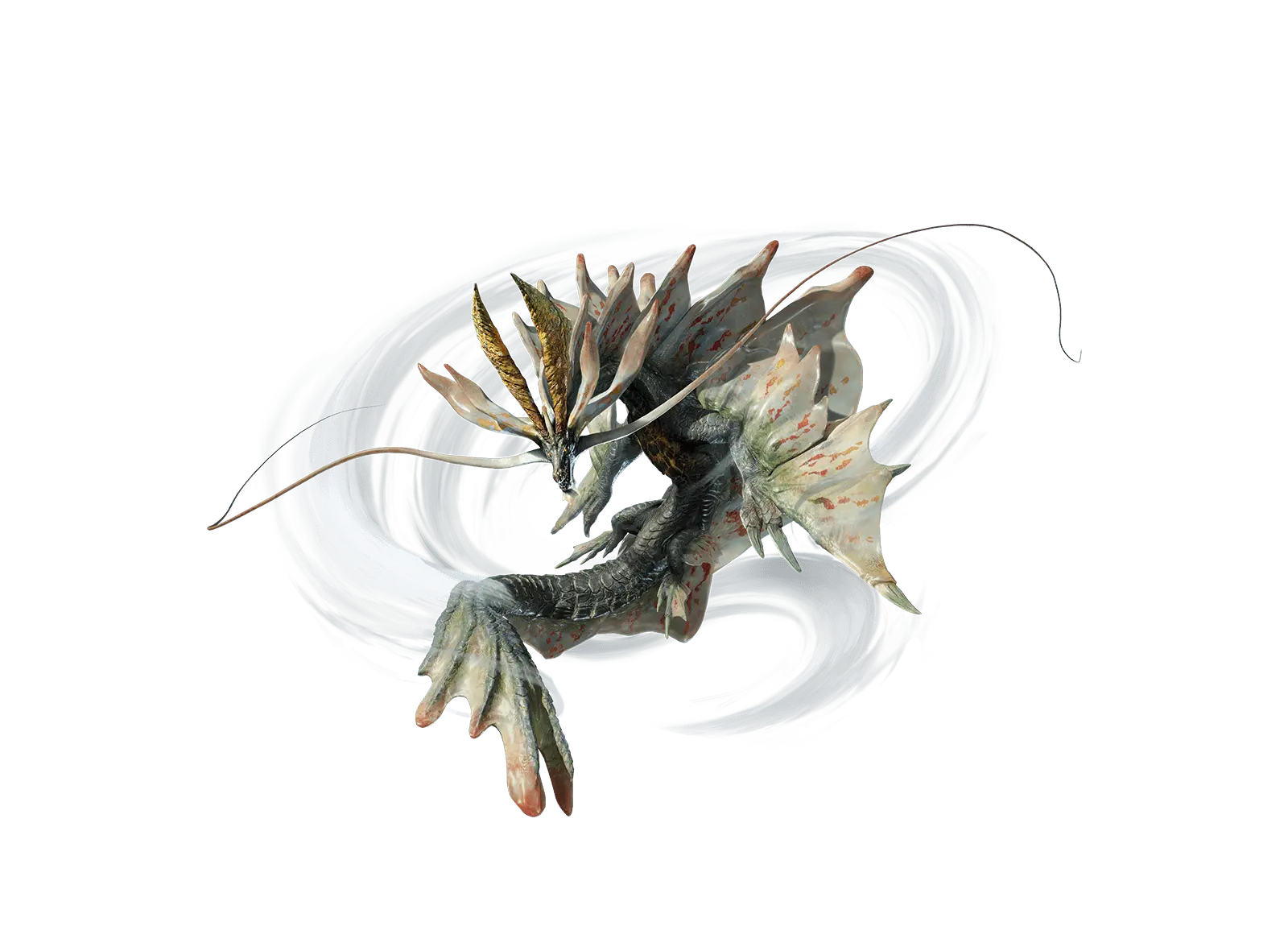 可操纵天气,引起暴风的古龙,人称“岚龙”。它可以利用飞膜形成气流,乘于这股气流之上,从而得以悬浮于空中。它那悠然漂浮的模样,宛如凌空起舞一般。环绕在它身上的风暴威力超凡,堪比天灾,将周围的一切化作灰烬。因其威胁之大,被某地称为“浩大灾劫”。当岚龙发挥真正的力量时,环绕它的风暴会更加强烈,周围还会降下雷电。 | |||||||||