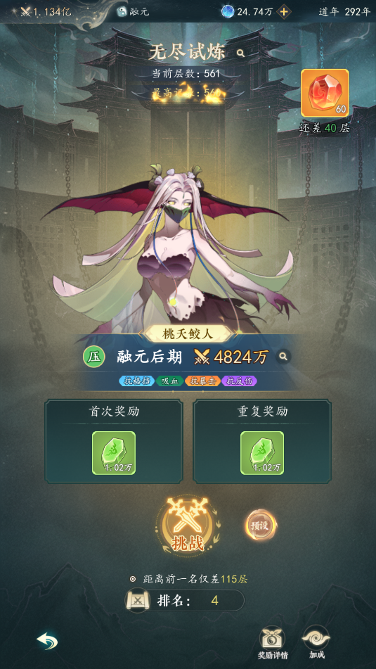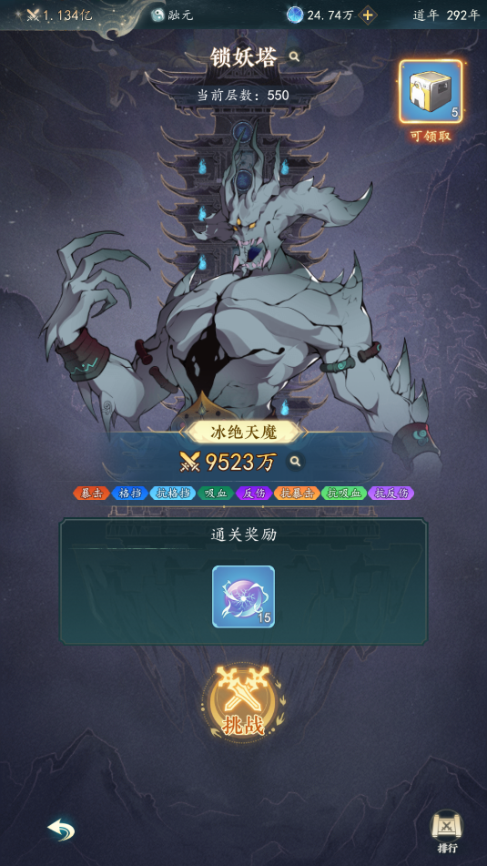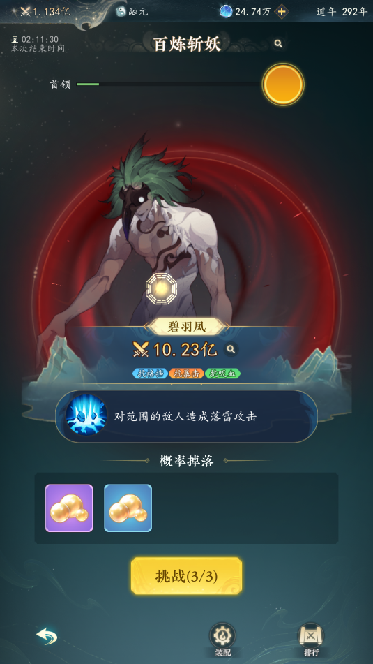 百炼斩妖类似于一个伤害测试的怪物,您对它造成的伤害越多,获得的奖励也就越多