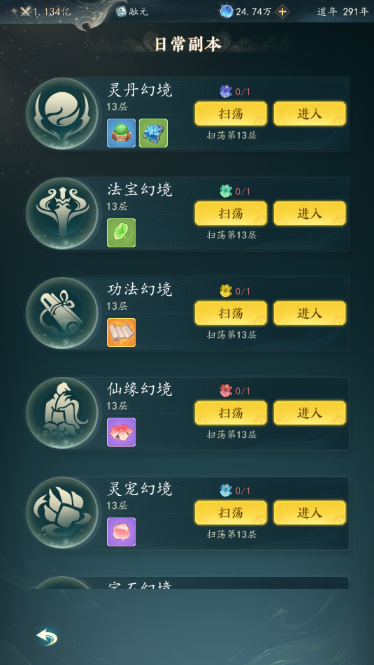 您可以在幻境中获得主流的修仙材料,无论您想提升法宝、功法、仙友、灵宠,幻境都是一个很会的选择