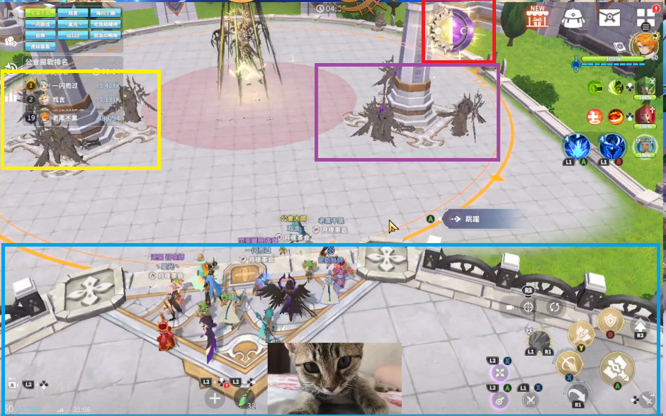 一段时间后,BOSS转阶段变为暗属性,此时光柱子(黄色区域)下面的一只小怪会先复活,先全力集火秒掉小怪才可打柱子。攻击光柱子维持光暗量普(红色区域)的平衡。