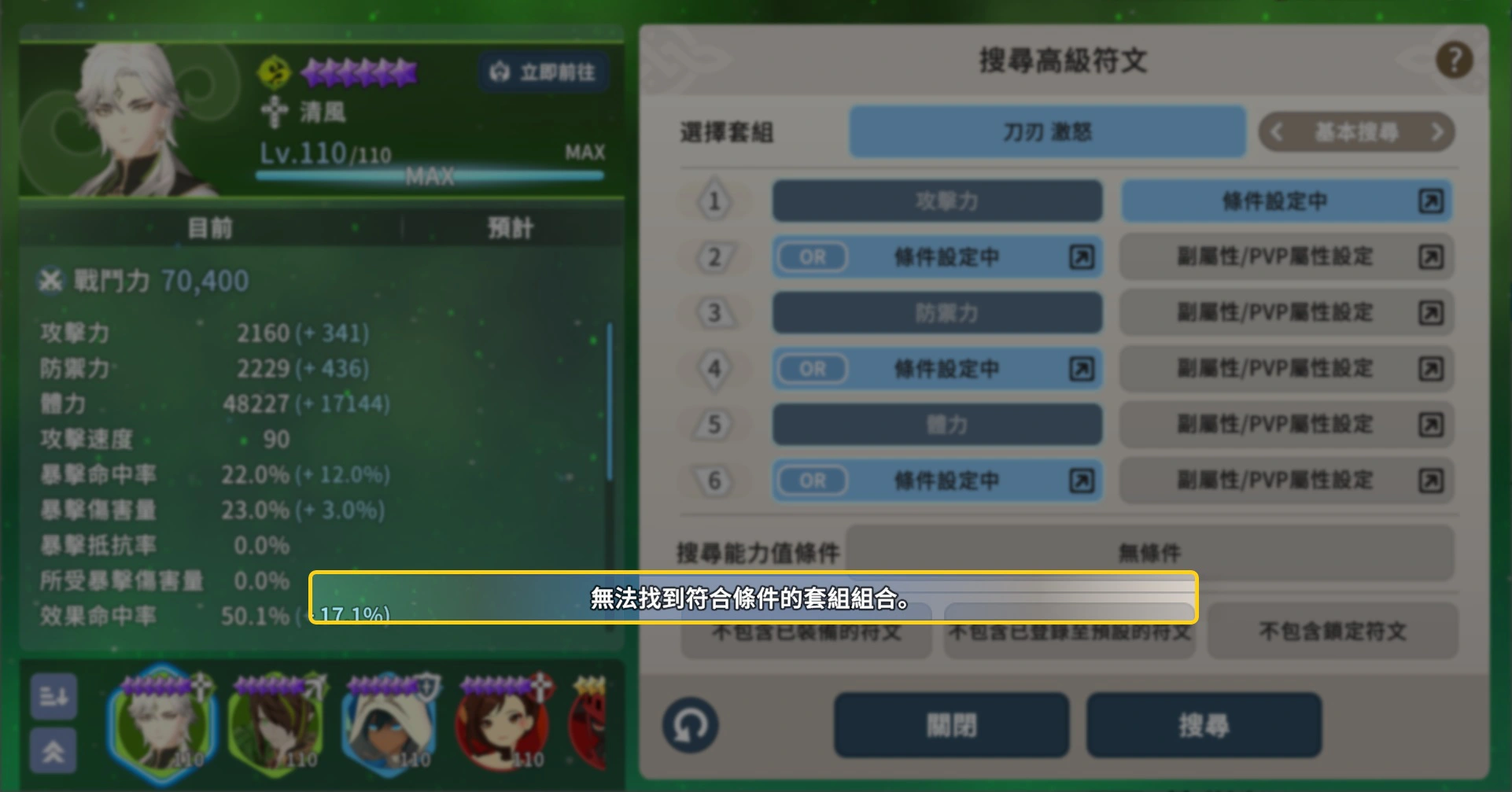首先,由於搜尋結果中的組合僅以特定能力值排序,若命中率或迴避率等排序基準以外的能力值較為重要,或需考量2種以上的能力值,則需逐一確認所有組合,增加搜尋的不便。此時,建議點擊重新搜尋按鍵,透過設定更嚴苛的條件來縮小搜尋範圍,以減少顯示的組合數量。但是,若點擊搜尋結果畫面的關閉按鍵,高級符文搜尋頁面將會關閉,導致先前精心設定的條件設定全部消失,因此請務必謹記使用重新搜尋按鍵!