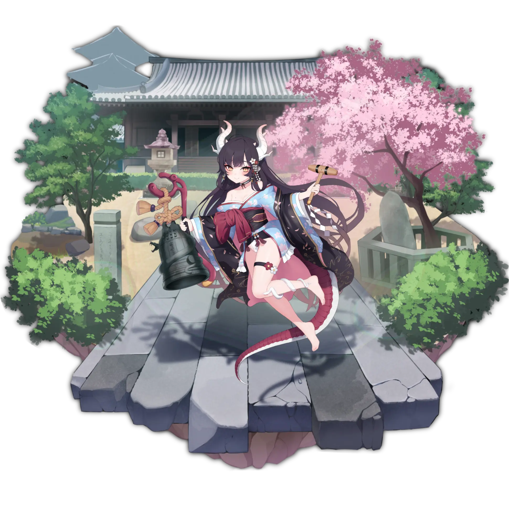 这个角色是妖怪。攻击力+20%。 在场时,为范围内我方妖怪增加自身攻击力20%的攻击力,这个效果会将自身排除在外。 对范围内的敌人造成自身攻击力5%[+2%]的持续伤害,在火属性格子时会发动两次。 | 妖怪卡池限定 | |||||||