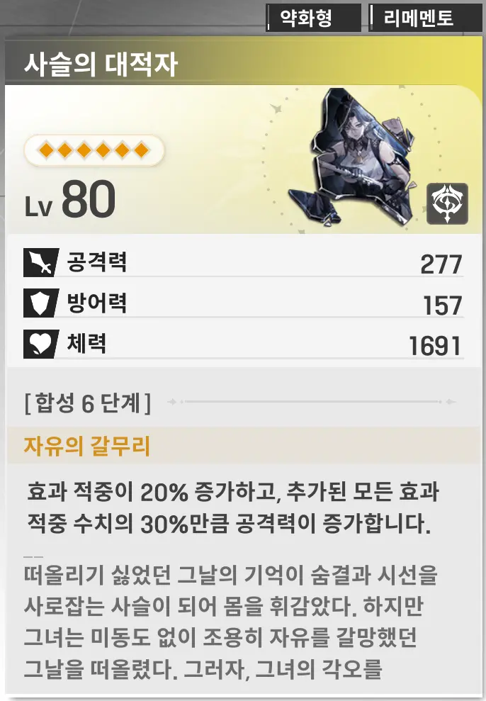 效果命中增加10~20%,并根据所有额外效果命中数值的15~30%提升攻击力。