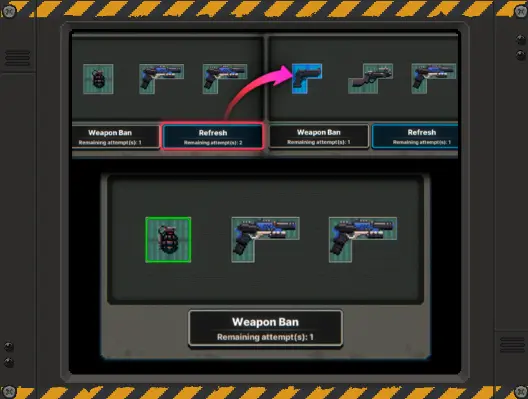 ![]() | 刷新及武器移除 ■刷新时,武器区域中的全部武器会消失,并出现固定数量的新武器。 ■当基本刷新次数使用完后,后续的刷新将消 耗金币。 ■武器移除时,可移除不需要的武器,而移除的武器不会再于武器区域出现。 |