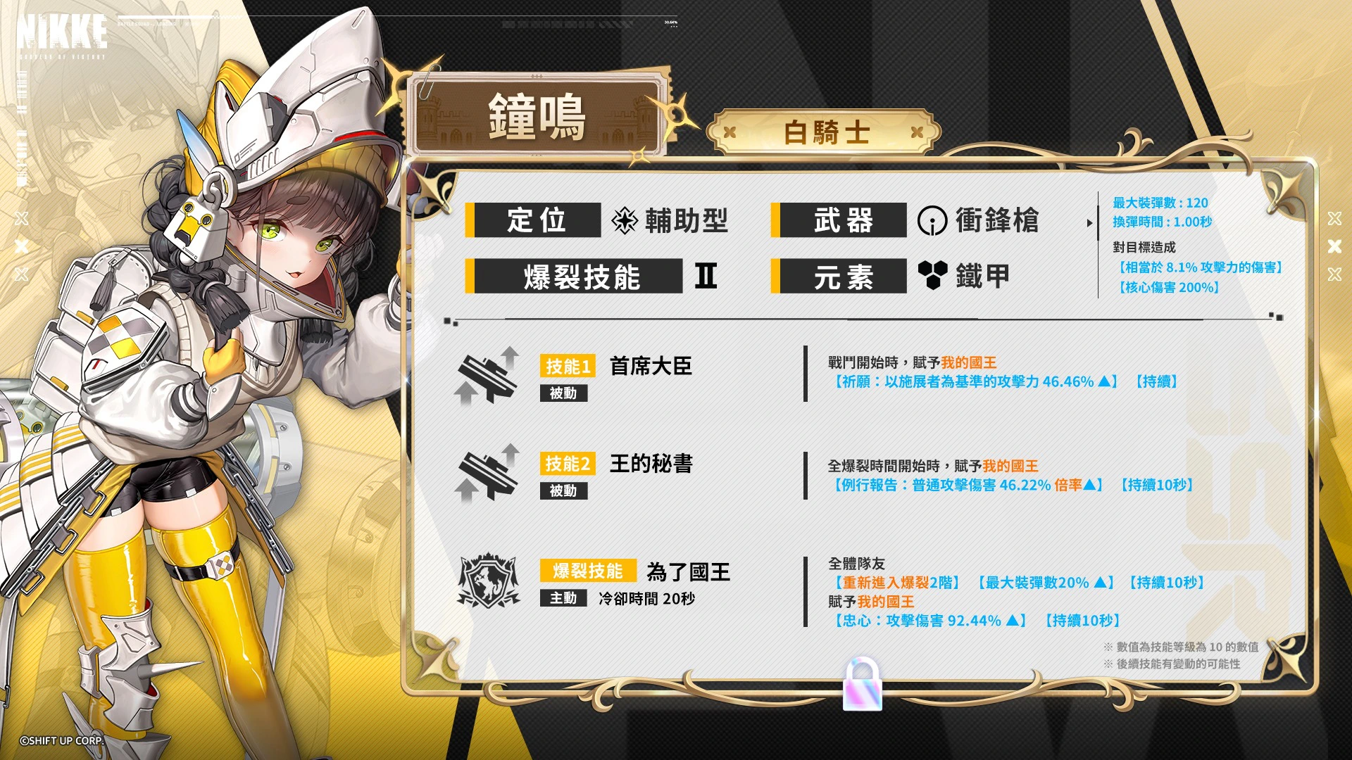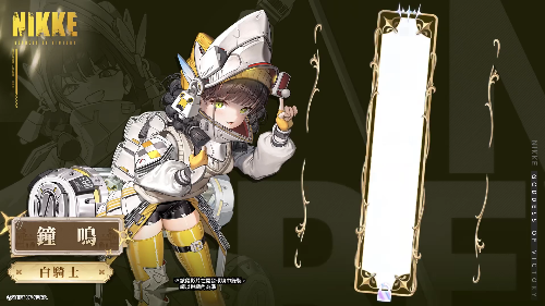 钟鸣是可以提升国王攻击力的辅助型妮姬。 使用爆裂技能时,能够进一步大幅提高国王的攻击力。