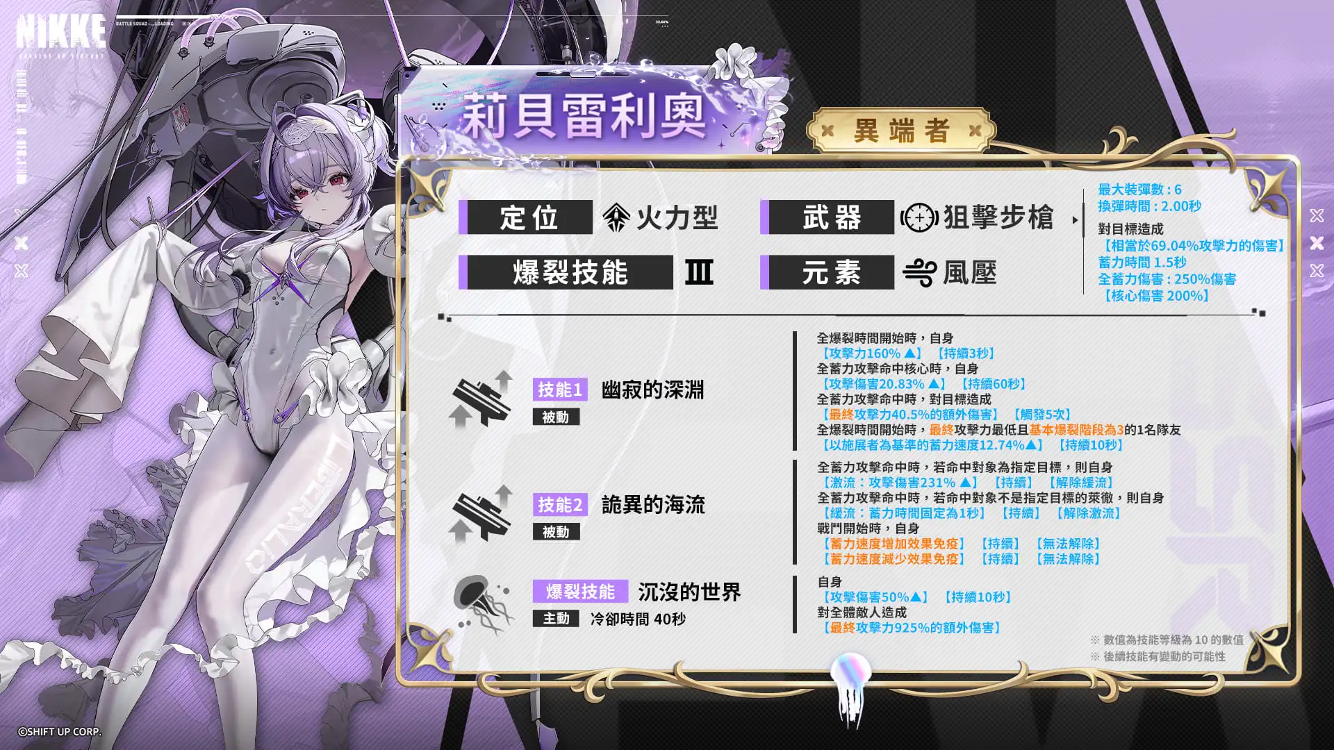 莉贝雷利奥是随著攻击目标不同而改变效果的火力型妮姬。 使用爆裂技能时,会提升自己的攻击能力,能对多名敌人造成强大的伤害。