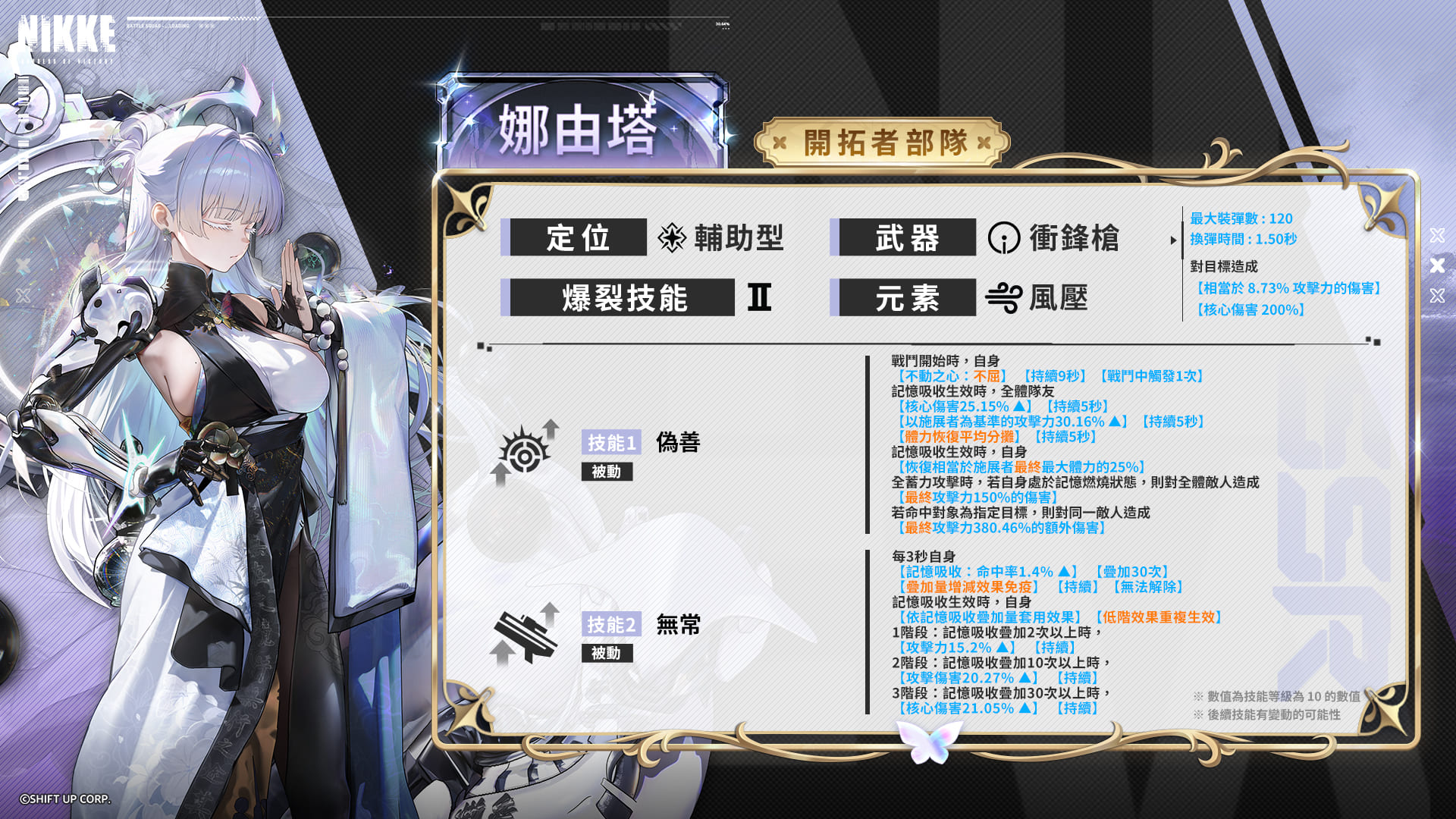 娜由塔是能透过记忆吸收来提升自身与队友攻击力,并恢复体力的辅助型妮姬。