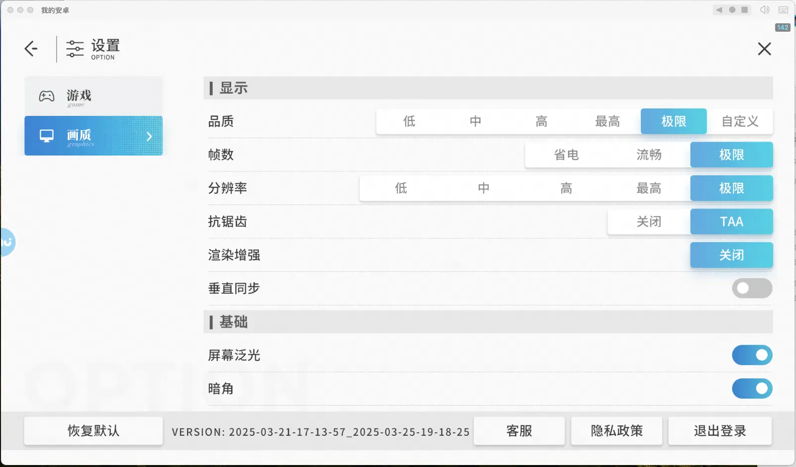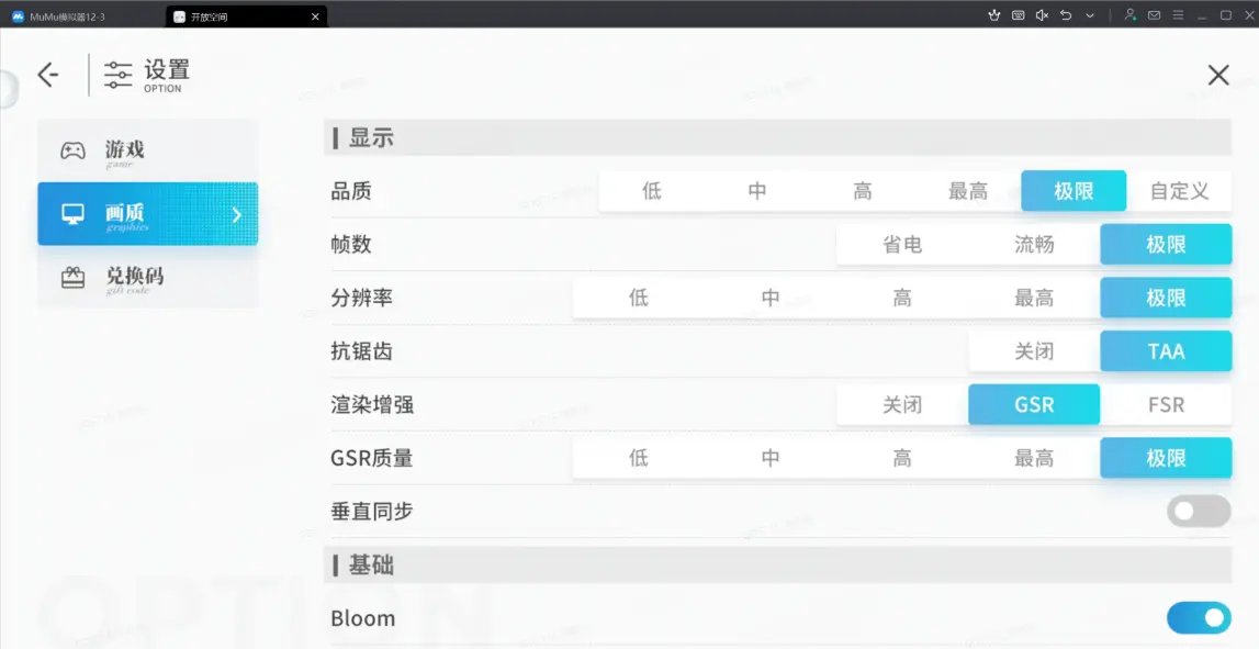 MuMu模拟器在最低性能设置时,支持开启极致画质,点击游戏左上角头像——设置