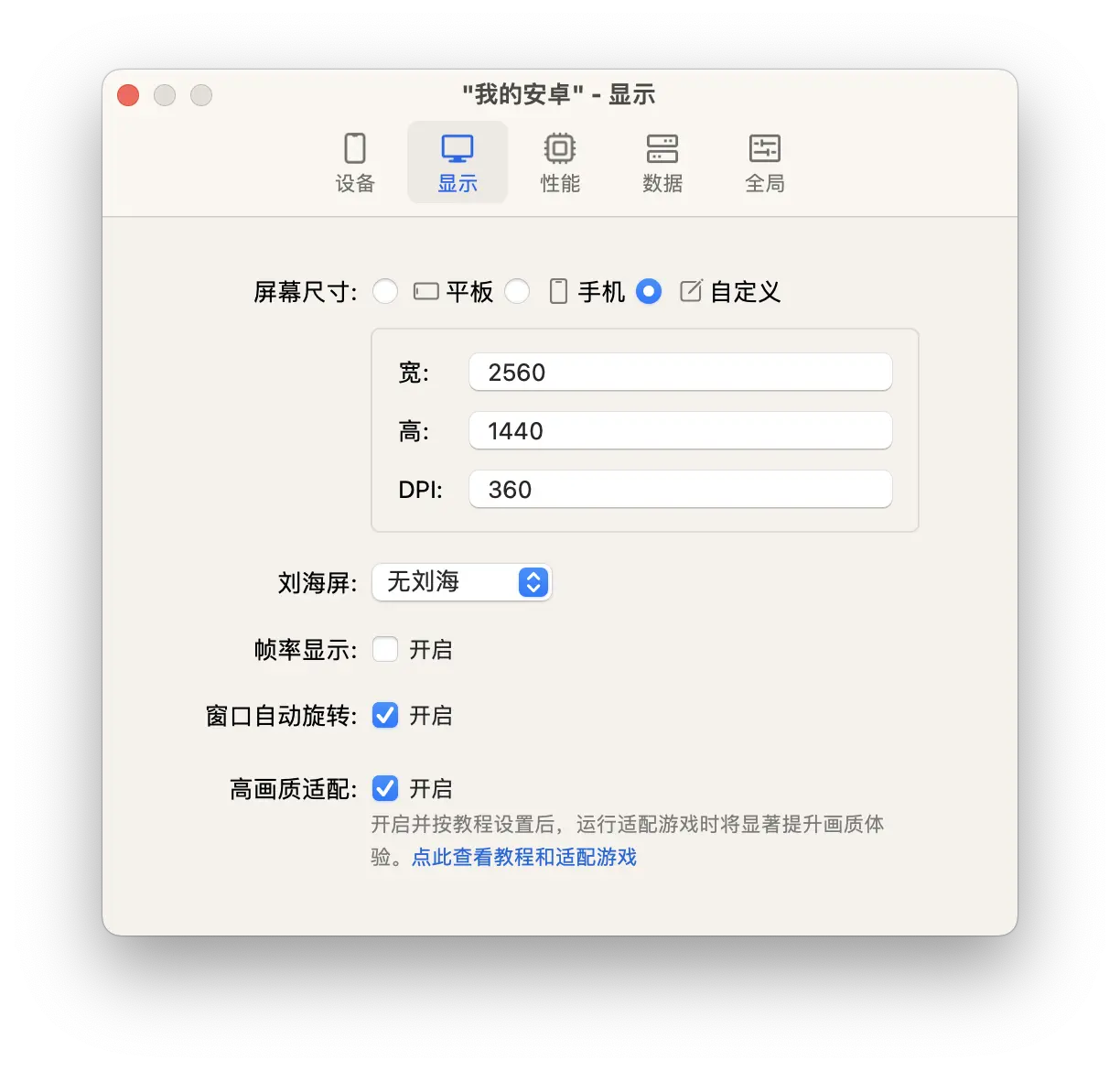 第二步,调整分辨率:点开显示界面,选择自定义编辑,将分辨率尺寸设置为2560*1440,DPI保持默认即可,分辨率越大,游戏画面会越清晰,点击F11或Fn+F11可全屏游玩