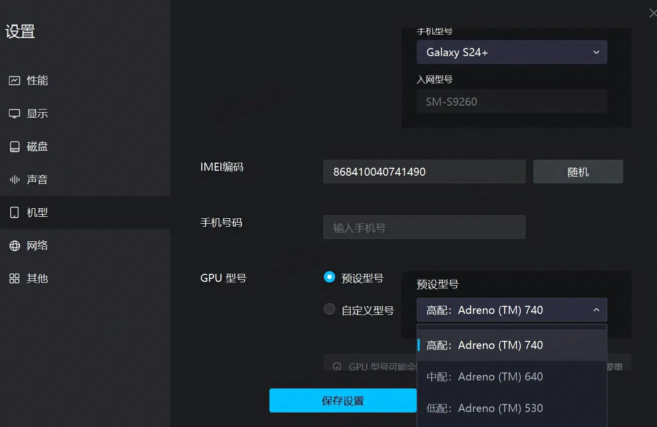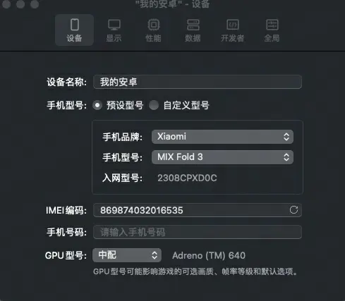 手机型号:预设型号(默认即可)