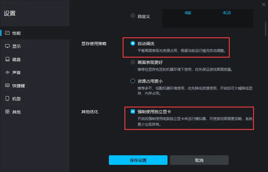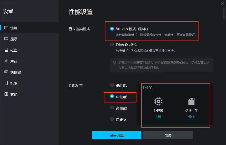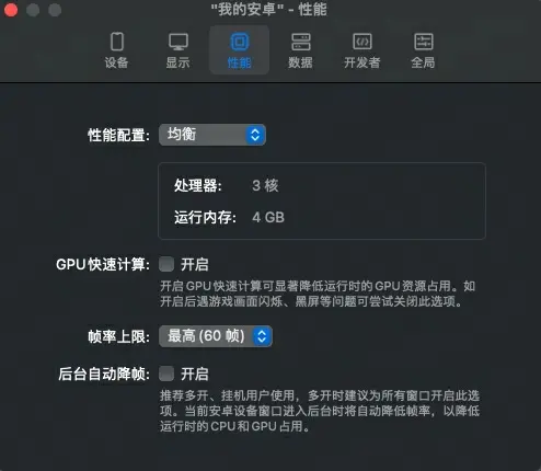 选择“均衡”以上(3 核 4GB 以上),帧率上限选择“最高(60帧)”