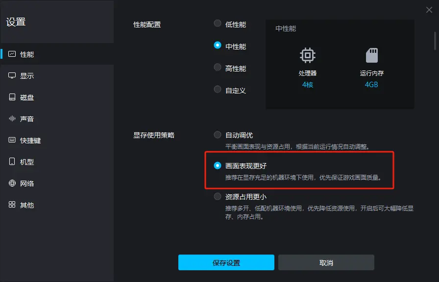 第一步,进行性能设置:点击模拟器右上角菜单-设置中心,点开性能设置界面,显存使用策略选择画面表现更好