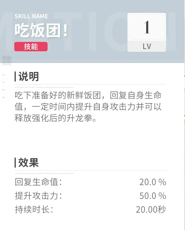 【伏】虽然是SR角色,但是作为玩家主控的角色,在前期角色数值差距普遍不大的情况下,比较出色地机制还是让她备受好评,【伏】的技能【吃饭团!】,冷却时间30秒,可以给自身提供高额攻击力加成,还可以回复一定血量,增强续航能力,并且角色打击感还是很在线的,总的来说,如果没有其他比较强力的SSR角色可供使用的话,【伏】是非常适合新手使用的角色。