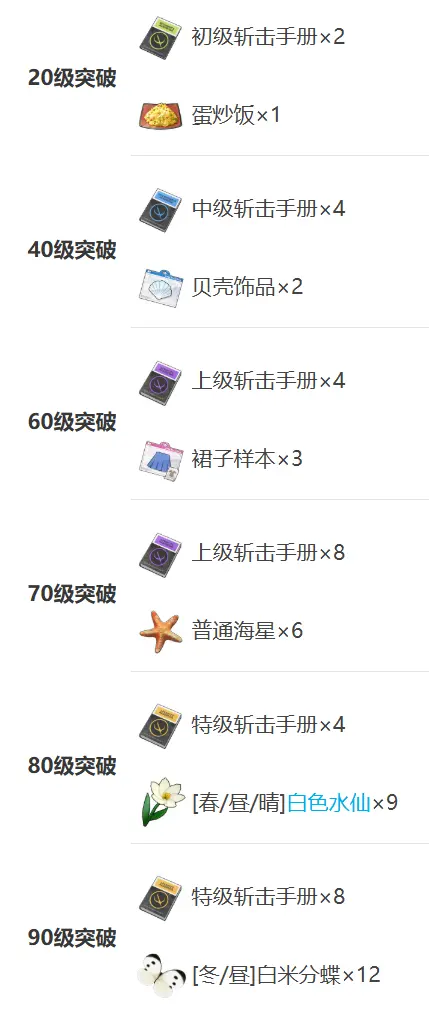 突破材料如下,需要看一下数据细节的可以在角色数据库看